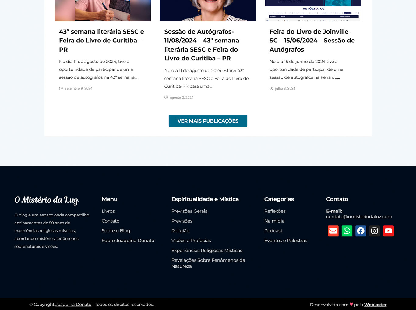 Explore o fascinante mundo da espiritualidade. No Blog O Mistério da Luz, Joaquina Donato compartilha 50 anos de vivências místicas, revelações e conexões profundas com o divino. Um espaço onde o mistério ilumina, inspira e transforma.
